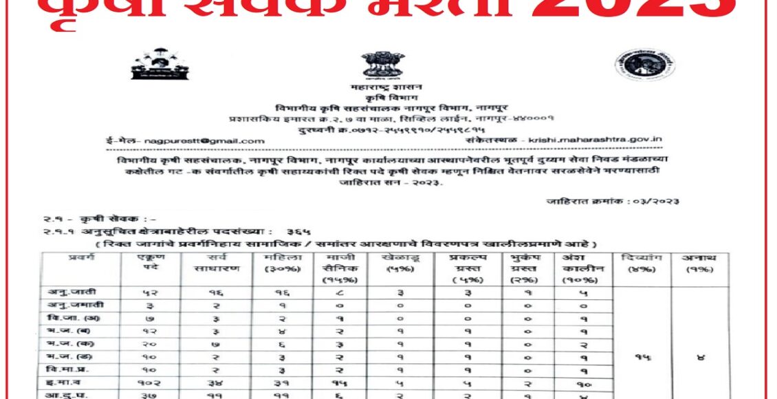Maharashtra Krushi Sevak Bharti 2023 | महाराष्ट्र कृषी सेवक भरती 2023 Maharashtra Krushi Vibhag ( Department ) published a notification regarding the Posts of “Krushi Sevak” in 2023. Candidates who are interested can read the notification and apply. What is Krushi Vibhag? It is department comes under the government of maharashtra. महाराष्ट्र कृषी विभाग मध्ये … Continue reading Maharashtra Job: महाराष्ट्र कृषी विभाग मध्ये ( कृषी सेवक ) पदांची भरती, बघून घ्या माहिती