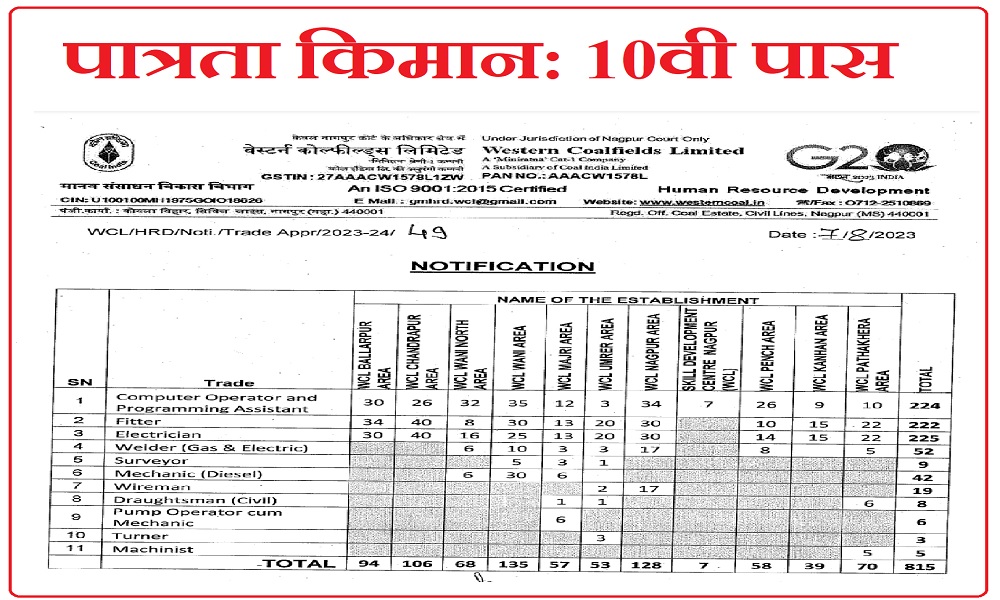 पदाचे नाव: डिप्लोमा ट्रेनी (Electrical), डिप्लोमा ट्रेनी (Civil), ज्युनियर ऑफिसर ट्रेनी (HR), ज्युनियर ऑफिसर ट्रेनी (F&A) आणि असिस्टंट ट्रेनी (F&A)